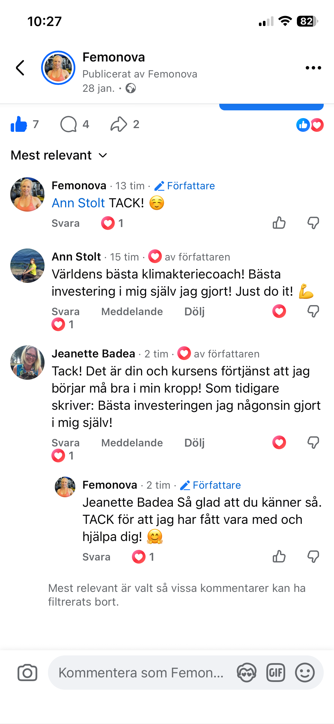 Nu driver jag företaget Femonova för jag ser ett stort behov av att hjälpa kvinnor att bevara och stärka sin hälsa mitt i livet när klimakteriet ger oss hälsoutmaningar. Jag är själv i klimakteriet och har varit där ett tag. Jag vet precis hur det känns att inte veta var man ska börja, hur man ska tänka, eller vart man ska vända sig med sina frågor. Jag vill att du ska känna att du inte är ensam.
